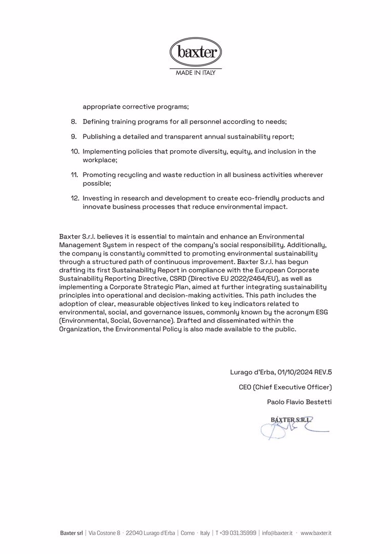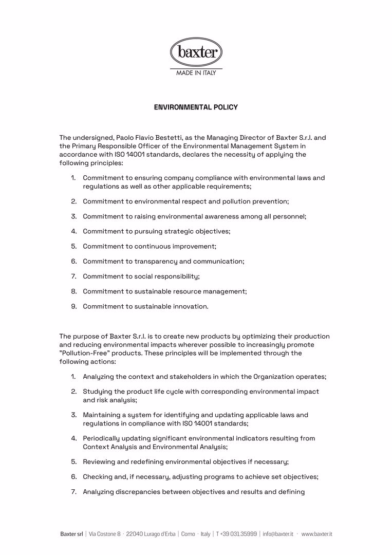 Da sempre Baxter tiene in grande considerazione l’impatto ambientale che comporta ogni aspetto della produzione e fa dell’ecosostenibilità uno dei suoi principi guida.