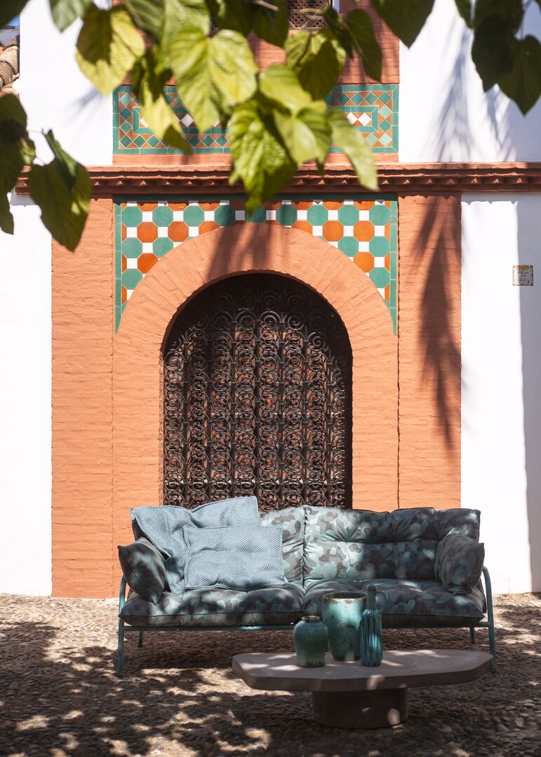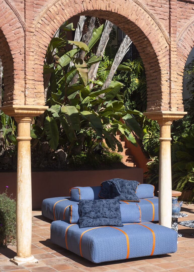 E se i pattern e i colori dei tessuti per il “fuori” sono forti e decisi - come il verderame, il blu e l’arancione - è perché Paola Navone è donna di carattere e di temerarie esplorazioni, sia di luoghi che di progetti, e queste collezioni raccontano della sua boldness.